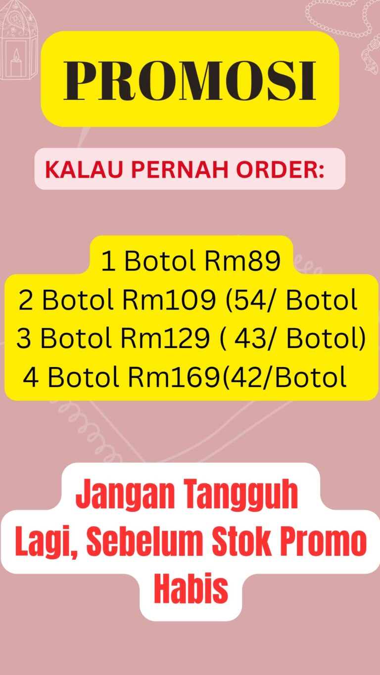 Kalau akak nak jimat lagi, akak boleh ambil pakej 2 botol, sebab harga asal untuk 2 botol RM300, tapi sekarang bos kami bagi hanya RM119 je,akak dapat jimat RM171 tau sekarang ni. dapat 2 freeGIft plk tu, waww!!